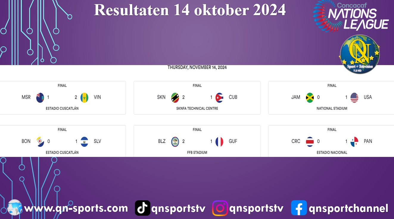 Concacaf Nations LeagueHighlightsVoetbal Concacaf NATIONS LEAGUE | Resultaten 14 november 2024 15/11/2024 © Ravin Birtantie Share article FacebookTwitterPinterestWhatsApp Latest articles Met deze selecties gaan AZ, FC Utrecht en Go Ahead de Europese week in Conference League 05/11/2025 Club Brugge houdt mede dankzij Ajax-mislukking Carlos Forbs punt over aan spectaculair treffen met Barcelona Champions League 05/11/2025 Ajax dieper in het moeras: Galatasaray pijnigt Amsterdammers in Champions League Champions League 05/11/2025 ‘Ik wil koste wat het kost naar het WK’ Highlights 05/11/2025 UFC Vegas 111 verliest twee gevechten op een dag voor het evenement Highlights 05/11/2025