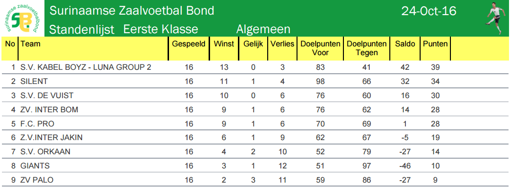 Na de speeldag van zondag 23 oktober zijn in alle klassen van de SZVB competitie over het competitiejaar 2016 de Play off ploegen bekent.In de hoofdklasse zullen Styx Kuldipsingh, ZV Mengao, The Lions en SV Kabel Boyz Luna Group 1 strijden om het landskampioenschap in de Kuldipsingh Futsal Play Off 2016.SV Kabel Boyz Luna Group 2, Silent, SV de Vuist en ZV Interbom spelen voor de titel in de eerste klasse.In de tweedeklasse hebben zich geplaatst: All Stars 2, Forca 16, ZVV Kismet en FCB.Terwijl Stibula, Styx MN Car Center, Pentagon 3 en SCSV Barka zullen uitmaken wie kampioen van de derdeklasse van de SZVB wordt.Gedegradeerd zijn Lengte Boys uit de hoofdklasse, ZV Palo uit de eersteklasse en ZV Nacional uit de tweedeklasse.De volledige standenlijst ziet er alsvolgt uit: