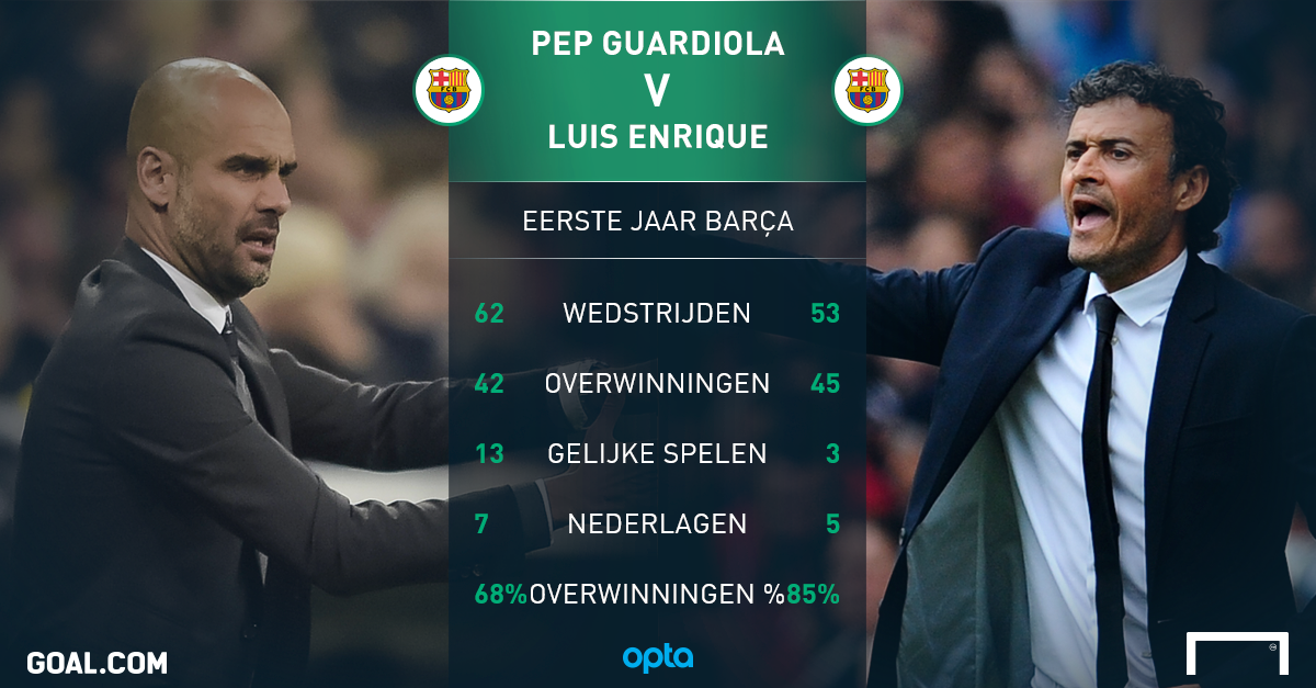 In voetbaltermen gesproken zijn de trainers gelijk. Ja, Barcelona heeft dit seizoen gewisseld, en Andres Iniesta staat wat ingezakter. Maar Luis Enrique en Guardiola hebben dezelfde filosofie. Beide ploegen spelen met een hoog percentage balbezit en wanneer ze de bal kwijtraken moet die zo snel mogelijk weer worden veroverd.