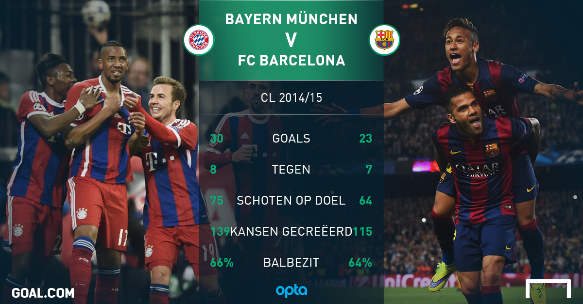 Barcelona schiet meer en scoort meer dan Bayern en Bayern heeft een beter defensief record. Maar wanneer je kijkt naar balbezit dan zijn er veel overeenkomsten.