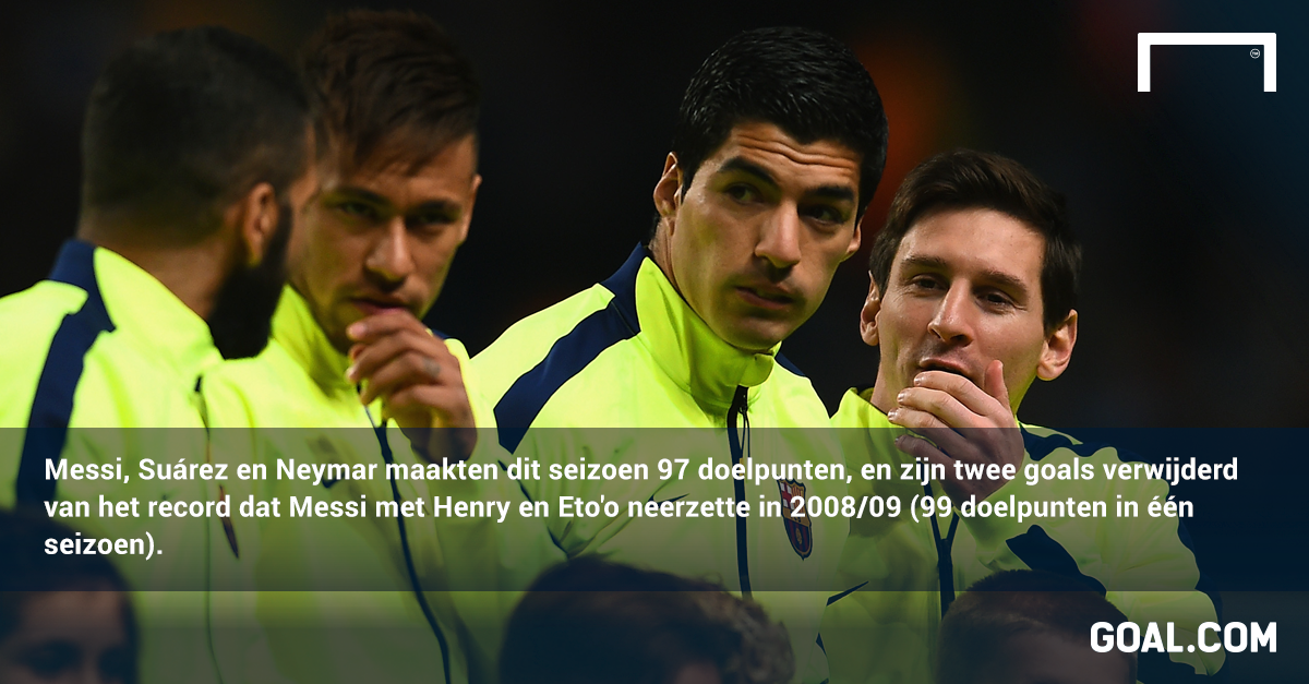 Dit seizoen heeft Messi er 47 achter zijn naam staan na 48 duels. Neymars teller staat op 31 uit 42 en Suárez, die de eerste twee maanden niet speelde wegens een schorsing, heeft nu negentien goals in 36 wedstrijden gemaakt.