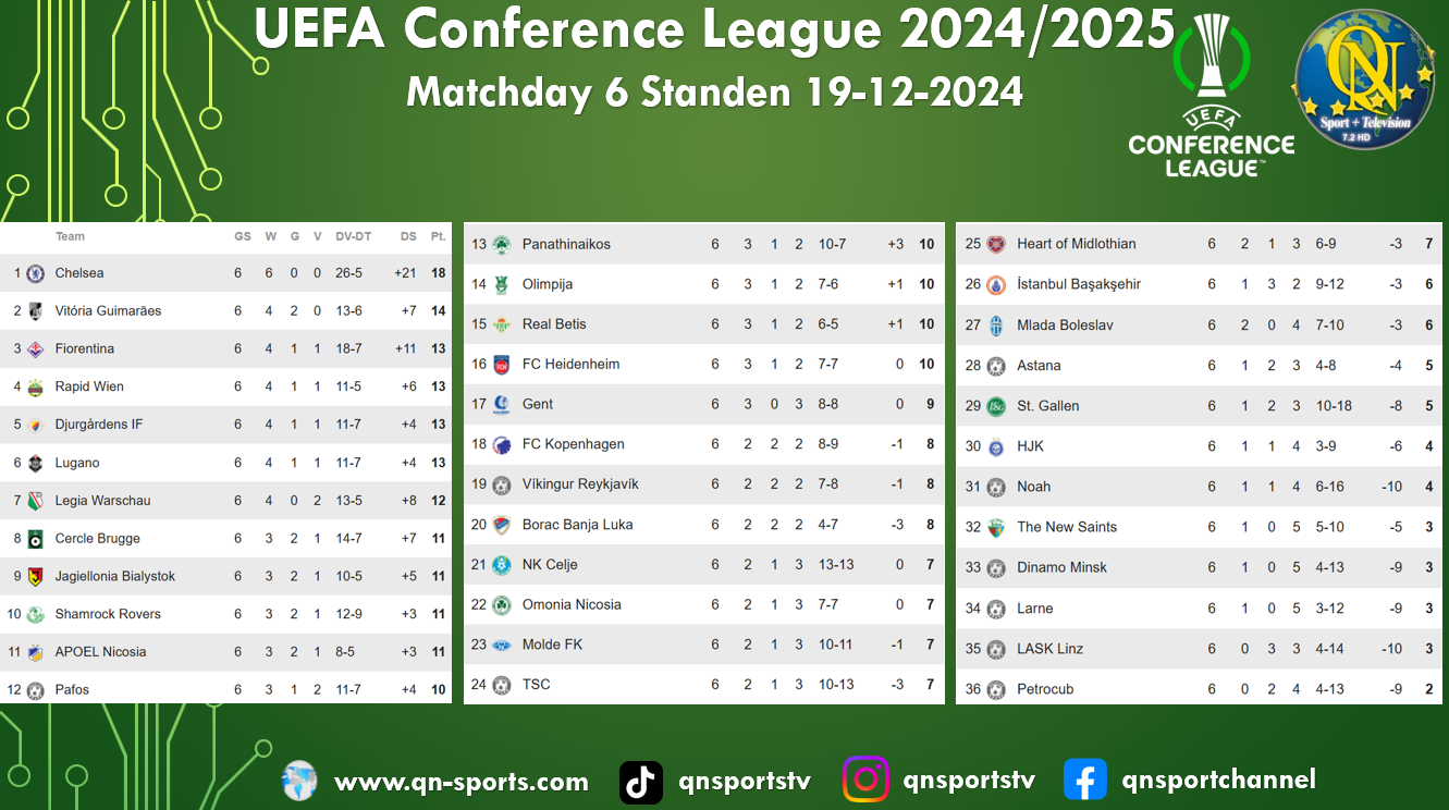 Confederations CupHighlightsVoetbal UEFA Conference League 2024/2025 uitslagen en standen | Matchday 6 per 19-12-2024 19/12/2024 © QN Creation © QN Creation Share article FacebookTwitterPinterestWhatsApp Latest articles Met deze selecties gaan AZ, FC Utrecht en Go Ahead de Europese week in Conference League 05/11/2025 Club Brugge houdt mede dankzij Ajax-mislukking Carlos Forbs punt over aan spectaculair treffen met Barcelona Champions League 05/11/2025 Ajax dieper in het moeras: Galatasaray pijnigt Amsterdammers in Champions League Champions League 05/11/2025 ‘Ik wil koste wat het kost naar het WK’ Highlights 05/11/2025 UFC Vegas 111 verliest twee gevechten op een dag voor het evenement Highlights 05/11/2025