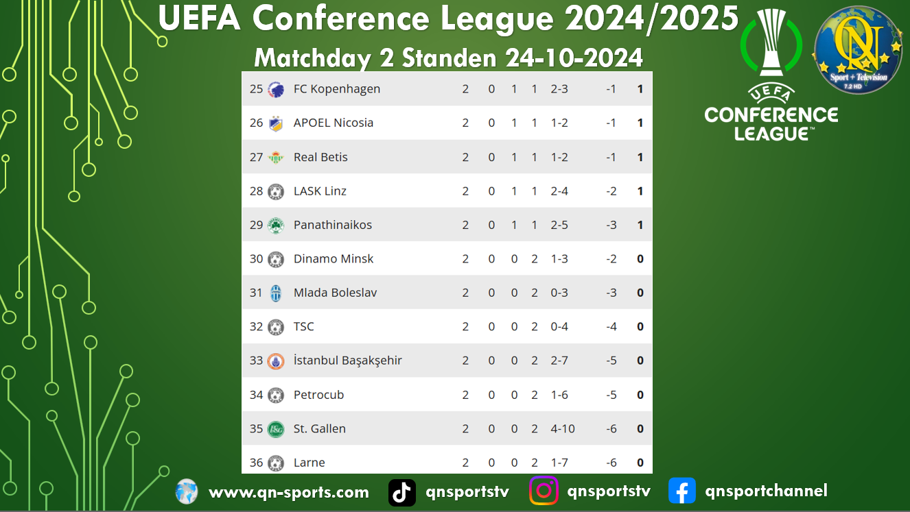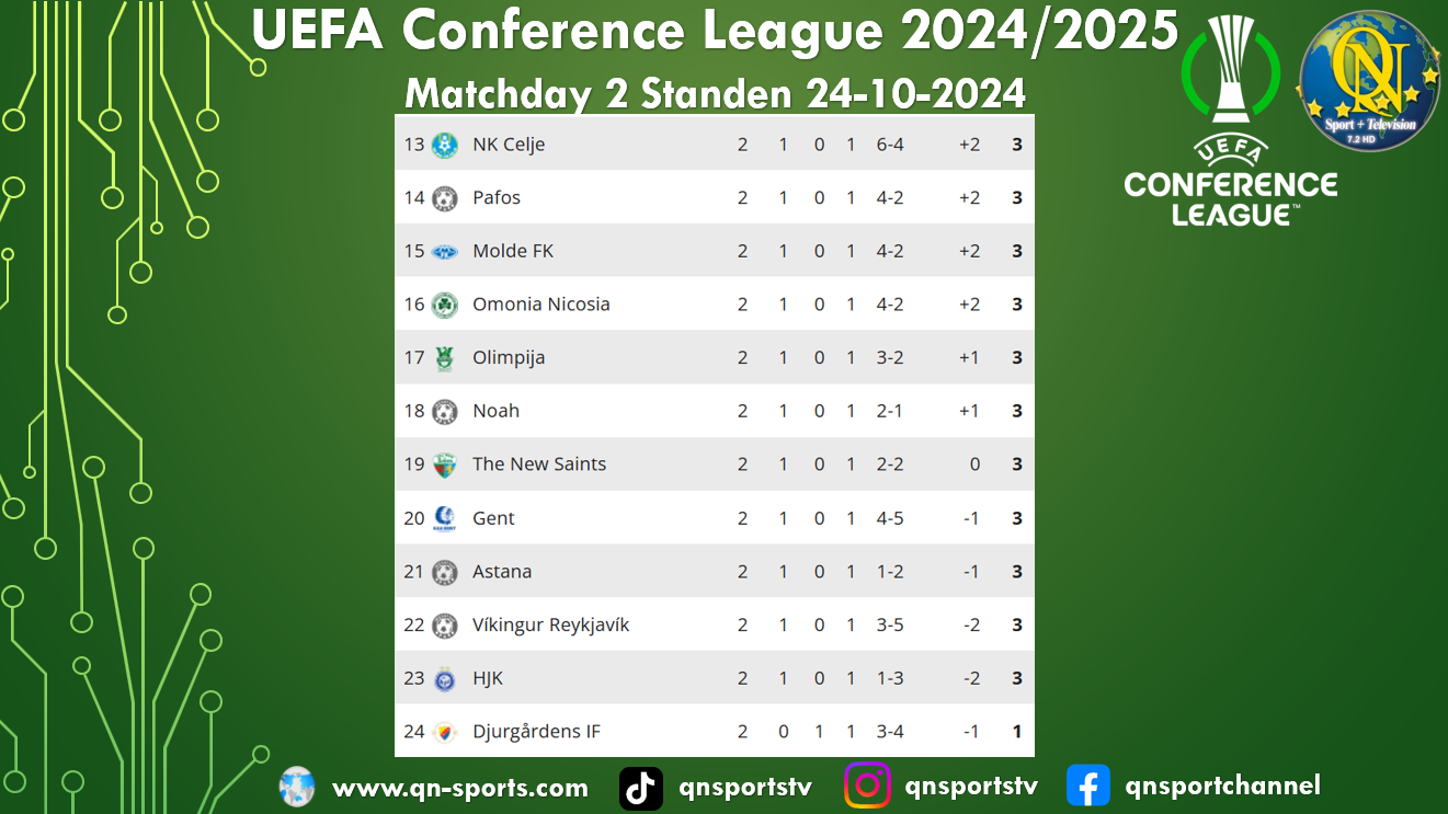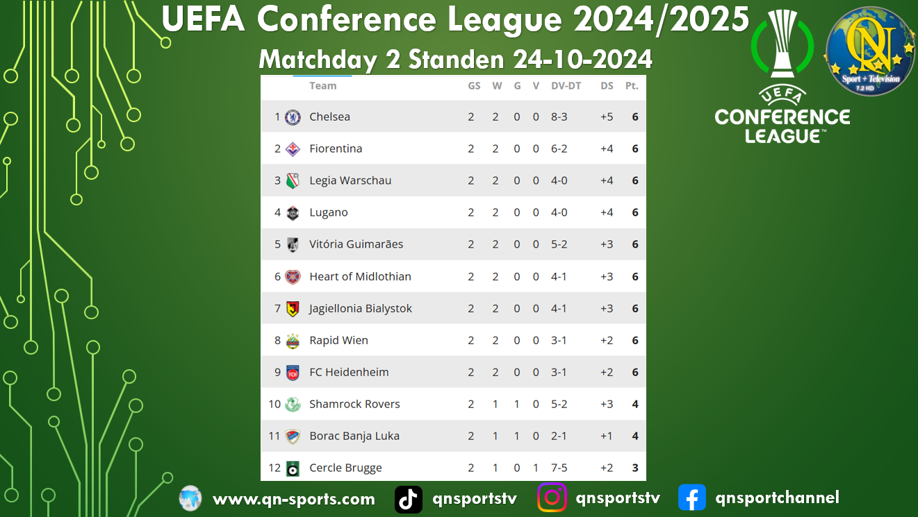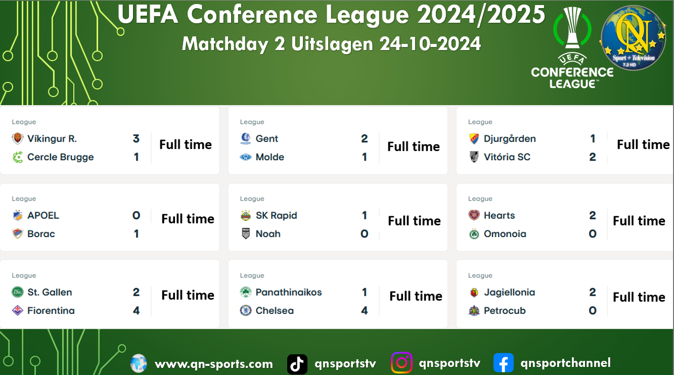 Conference LeagueHighlightsVoetbal UEFA Conference League 2024/2025 Uitslagen & Standen per 24-10-2024 – Matchday 2 24/10/2024 Share article FacebookTwitterPinterestWhatsApp Latest articles Gilgeous-Alexander scoort 55 punten terwijl OKC de tweede opeenvolgende 2OT-overwinning behaalt Basketbal 24/10/2025 Liverpool-trainer Arne Slot laat zich uit over reserveplek van sterspeler Mo Salah Champions League 24/10/2025 Herbert en Vidal leiden Chargers naar overtuigende overwinning op Vikings Highlights 24/10/2025 Stephen Curry’s 42 punten helpen Warriors de Nuggets te verslaan in een spannende 137-131 OT-overwinning Basketbal 24/10/2025 Resultaten UFC 321 weging: titelgevechten vastgelegd, 2 vechters missen gewicht Highlights 24/10/2025